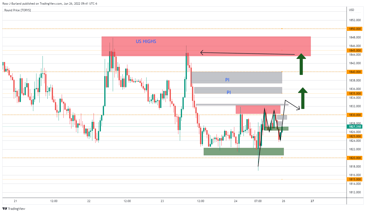 A bullish case for gold comes above the current consolidation rage above 1,832 towards the prior highs in the prior two US sessions and then $1,850 as follows:
