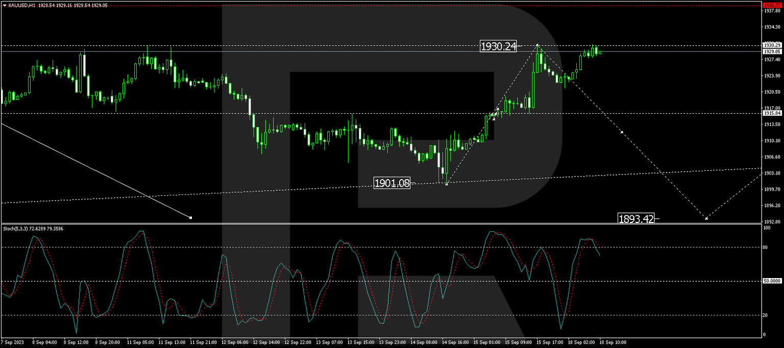 On the 1-hour chart, the price has formed a consolidation zone around $1915.85. Breaking out of this range to the upside, it has corrected to $1930.25. A retracement to $1915.00 is anticipated today. If this level is decisively breached, the door may open for a more significant drop to $1893.40. The Stochastic oscillator supports this outlook, showing its signal line above the 80 mark but trending strictly downward.