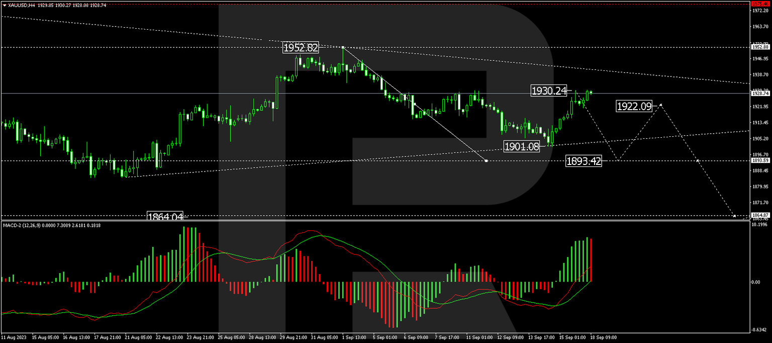 On the 4-hour XAU/USD chart, a downward wave has concluded at $1901.00, followed by a corrective rally to $1930.00. A consolidation phase is anticipated below this level. Should the price break below the consolidation range, there's potential for an extension of the downward wave to $1893.40. The Moving Average Convergence Divergence (MACD) confirms this scenario, with its signal line positioned above zero but appearing to gear up for a downward movement.