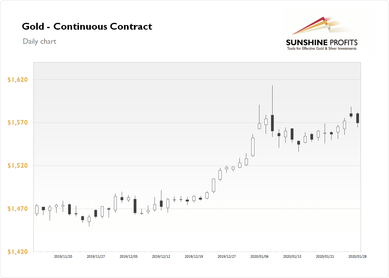 The gold futures lost 0.48% on Tuesday, as it retraced its Monday’s advance. The financial markets reacted to better-than-expected U.S. economic data releases (Durable Goods Orders, CB Consumer Confidence) and China virus fears somewhat eased yesterday. On last week’s Wednesday gold has bounced off $1,550 level, and since then it gained almost 2.5%. The market trades within a short-term uptrend as it is still retracing some of its move lower from the January 8 medium-term high.