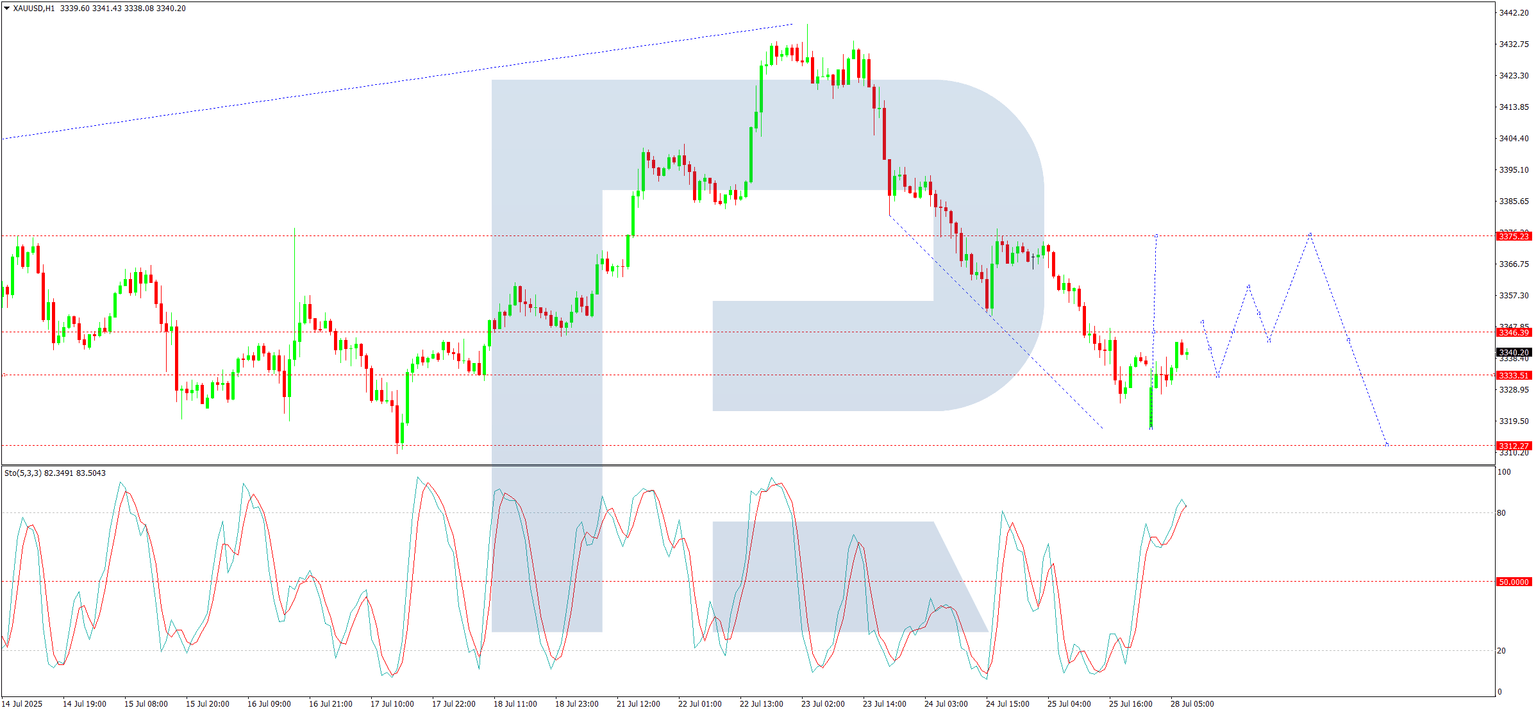 On the H1 chart, the market has achieved its local decline target at 3,318. Currently, an upward impulse is forming towards 3,349. A consolidation range near 3,346 may develop, with an upside breakout potentially extending gains to 3,375. Thereafter, a new downward wave towards 3,312 could emerge. The Stochastic oscillator aligns with this outlook, as its signal line is above 50 and rising sharply towards 80.