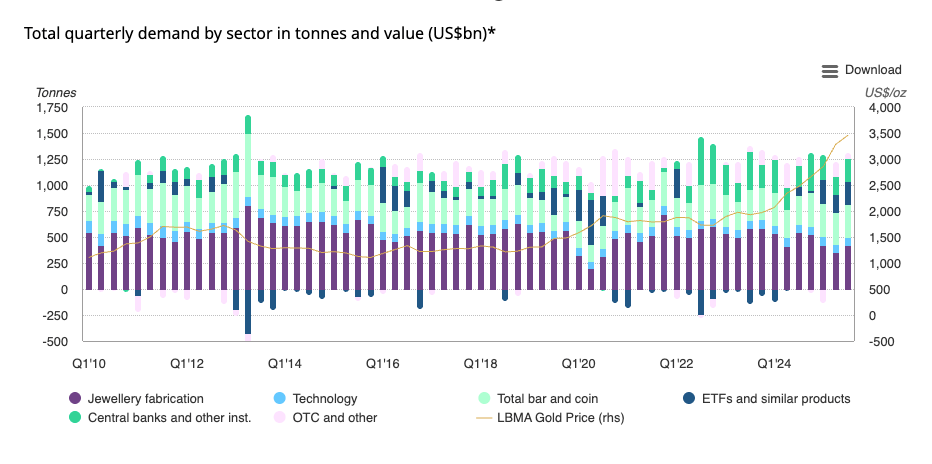 Third quarter demand grew even as the gold price surged 16 percent and set 13 new all-time highs. The gold price averaged $3,456 during the quarter, up 40 percent year-on-year and 5 percent from the last quarter.