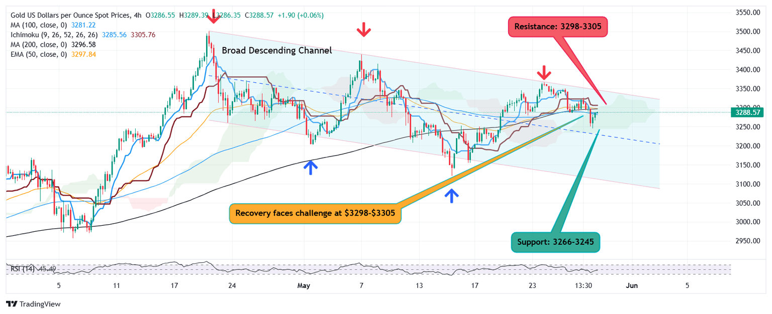 Four-hourly 100 SMA $3281 holds as immediate support of rebound rally while 4-hour 200 SMA and 50 EMA $3298 pose challenge above which next overhead resistance sits at $3305