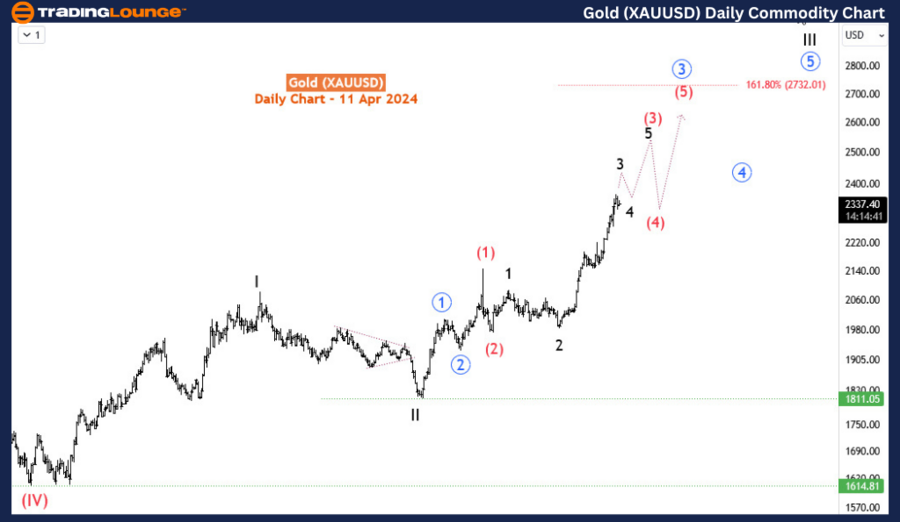 On the daily chart, the current impulse cycle corresponds to the supercycle wave (IV). Presently, we find ourselves in the cycle degree wave III of (IV). Based on the Fibonacci projection, wave III has the potential to extend to the 161.8% projection of wave I from II, reaching a level of 2732. This serves as a long-term target for Gold enthusiasts. Currently, the price resides in wave 3 of (3) of blue wave 3 of III. As there are still several waves pending completion before reaching the projected target, the next buying opportunity is anticipated after wave 4, given that wave 3 is nearing its fulfillment.