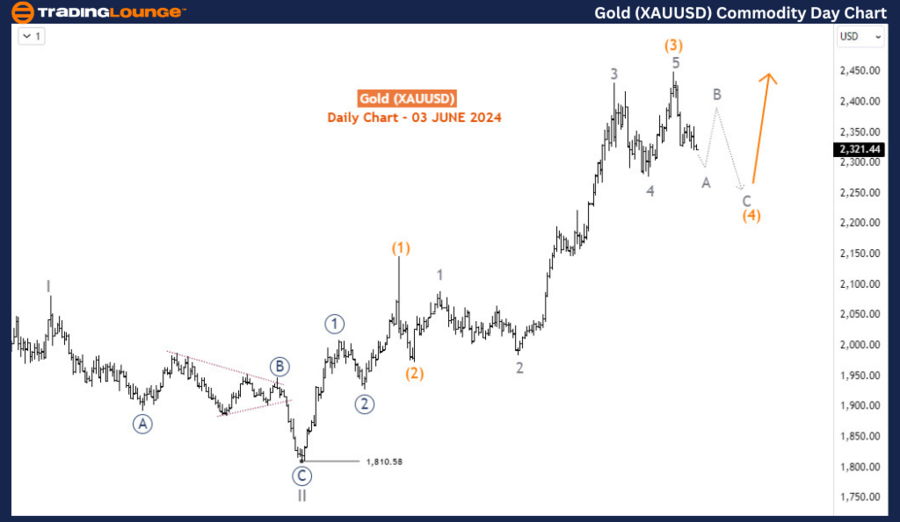 On the daily chart, the rally resumed at 1810 in October 2023 after the previous pullback from May 2023 was completed. At 1810.58, cycle degree wave II ended, and wave III began. The high on May 20, 2024, marked the peak of the intermediate degree wave (3) of the primary degree wave 3 (circled in blue), indicating that the bullish trend remains intact. The current pullback is forming intermediate degree wave (4), which, once completed, will pave the way for the bullish trend to continue higher in wave (5).