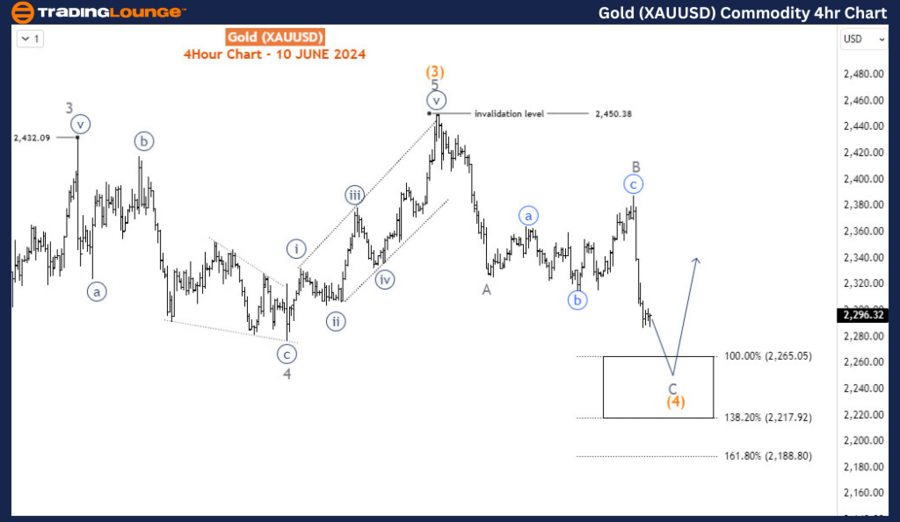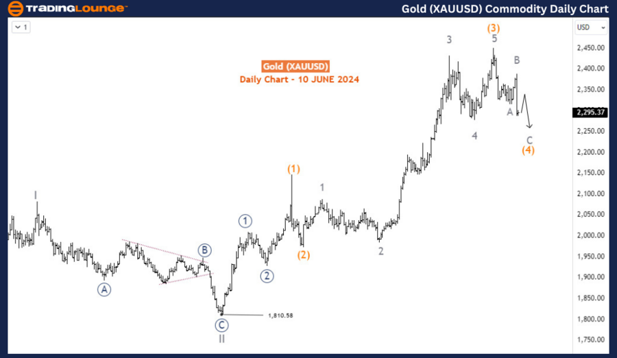 The daily chart shows that the intermediate wave (3) concluded at 2450 with an expanding diagonal structure. Since reaching this high, Gold has been in a corrective phase. Typically, the fourth wave (wave (4)) corrects up to 38.2% of the third wave (wave (3)) and can sometimes approach the 50% retracement level. It usually does not surpass this level; otherwise, it could signify a different wave structure. In this scenario, Gold could decline in wave (4) to 2269, which represents the 38.2% retracement of wave (3), or even further to 2213, corresponding to the 50% retracement level.