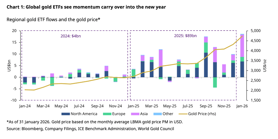 According to the World Gold Council, “Inflows benefited from both the price rally and rising geopolitical tensions involving the U.S. and regions such as Iran, Greenland, and parts of Europe, which helped sustain investor interest in gold.”