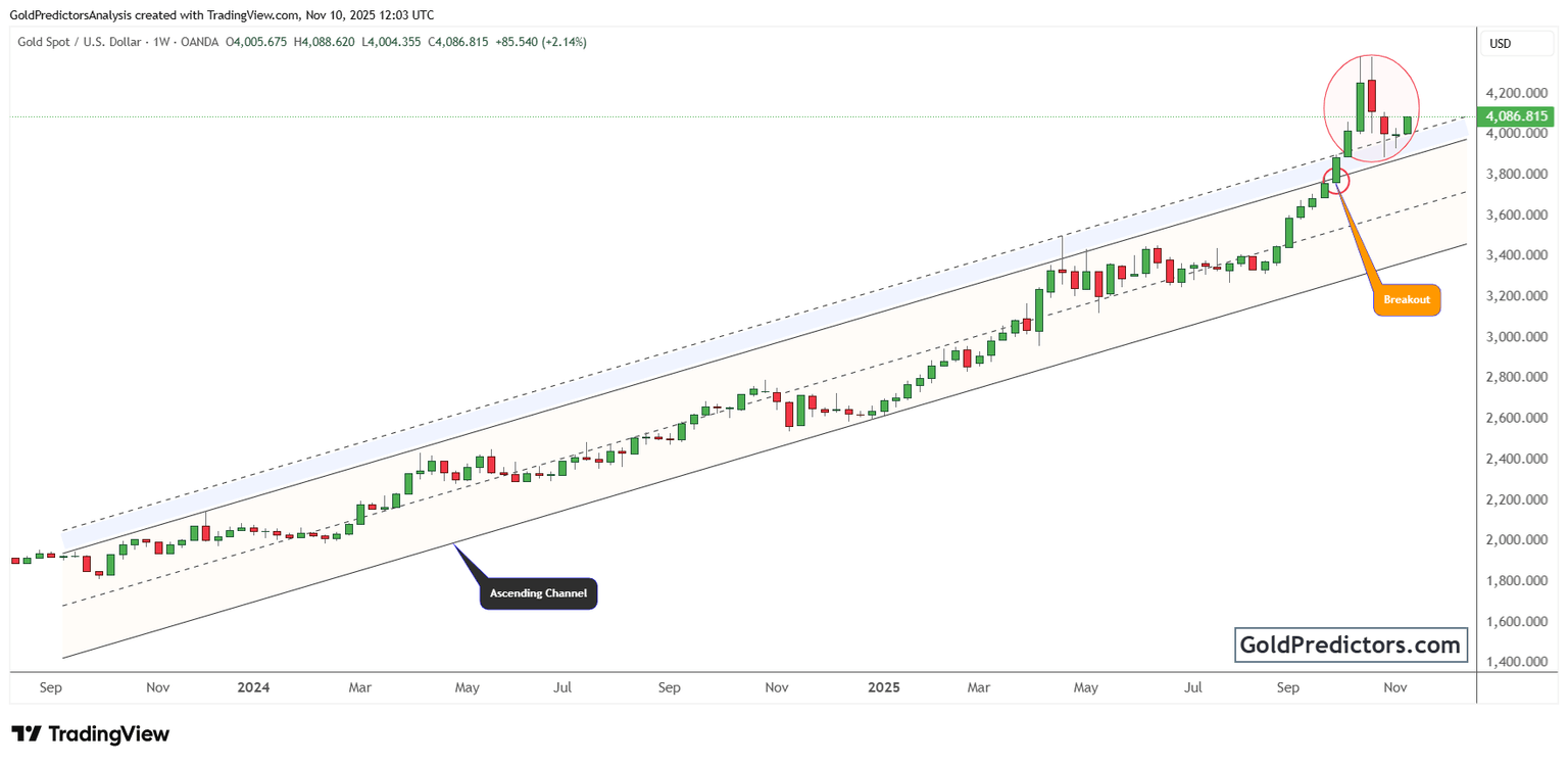 Gold recently broke above the channel’s upper boundary, signaling a key technical shift. The breakout pushed the price firmly above the $4,000 level, marking the start of a more aggressive upside phase. The breakout candle showed strong volume and momentum, confirming conviction behind the move.