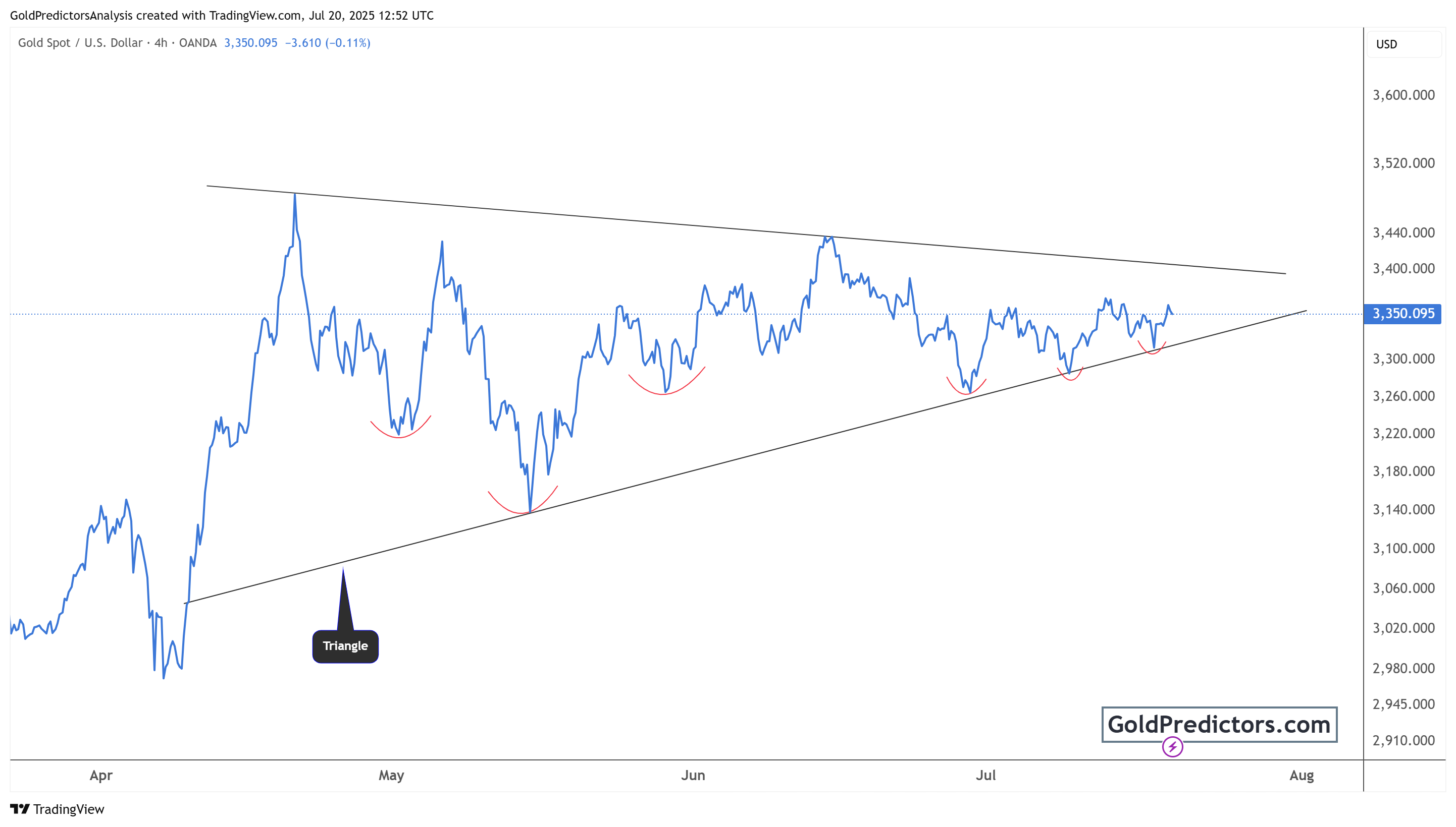 The chart below shows that gold is trading within a well-defined symmetrical triangle pattern that has been developing since April. Multiple touches on both the rising support line and the falling resistance line mark this formation. The base of the triangle started near the $2,950 level, and since then, the price has formed a series of higher lows and lower highs, steadily tightening the trading range.