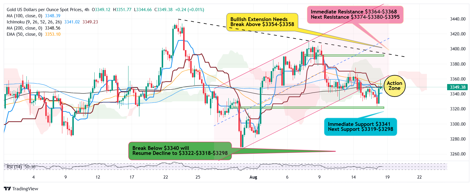 Markets seem to have digested Trump-Putin summit fiasco reflected in early Asian session trading which witnessed a quick drop to $3323 followed by buyers stepping in for a rebound to $3358 as caution on Trump-Zelensky meet keeps traders on toes and counting on further developments.