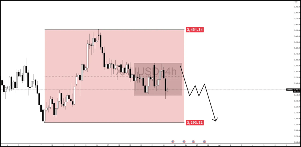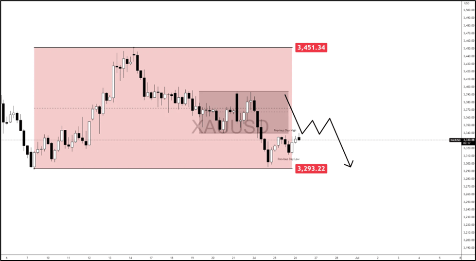 The narrative behind this is that if the ceasefire gains traction and Iran steps back and opens door to diplomacy, risk appetite may rebound, dragging gold down. A clean break and close below $3,300 would open downside potential to the $3,250 level or even $3,200. Also, the rejection of the midrange acted as a technical catalyst that weighs Gold down.