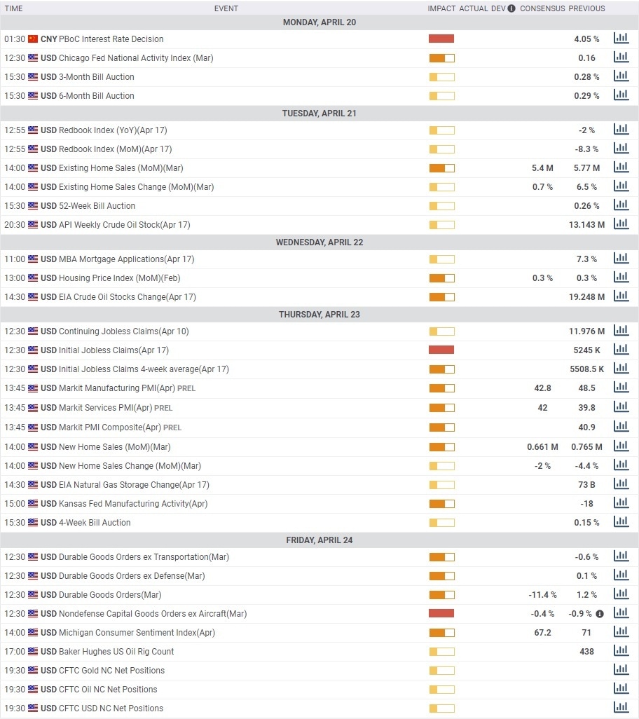 The IHS Markit's preliminary Manufacturing and Services PMI data from the US for April will be looked upon for fresh clues regarding the coronavirus outbreak's damage to the economic activity. On Friday, Durable Goods Orders and the University of Michigan's Consumer Confidence Index will be watched closely by the market participants as well. Moreover, investors will focus on first-quarter earnings figures from large US firms and Wall Street's reaction.
