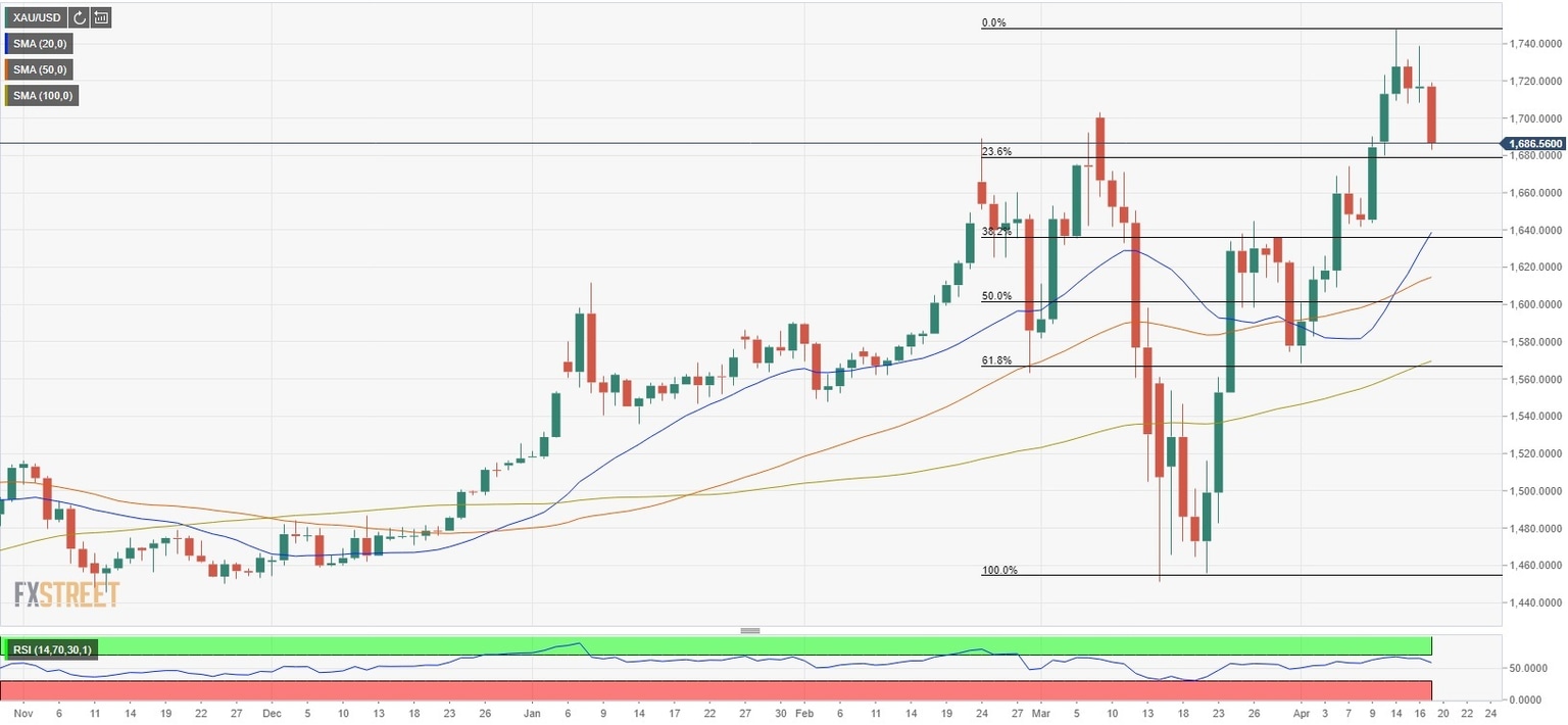 The initial support for the pair aligns at $1,680 (Fibonacci 23.6% retracement of the Mar. 20 - Apr. 14 rally). With a daily close below that level, the pair could extend its slide toward $1,660 (Apr.6/Apr.7 daily closing level) and $1,640 (20-day SMA).