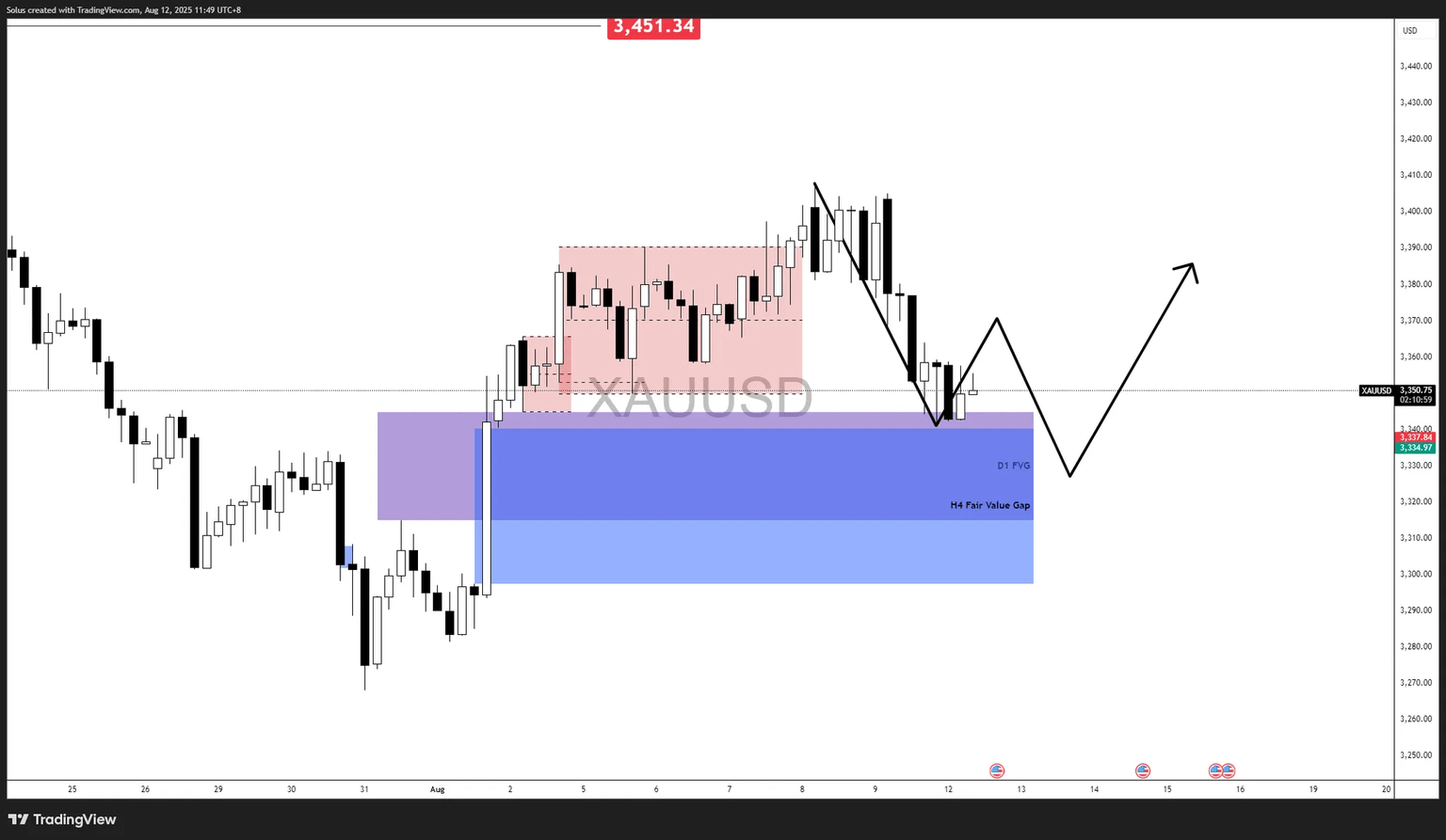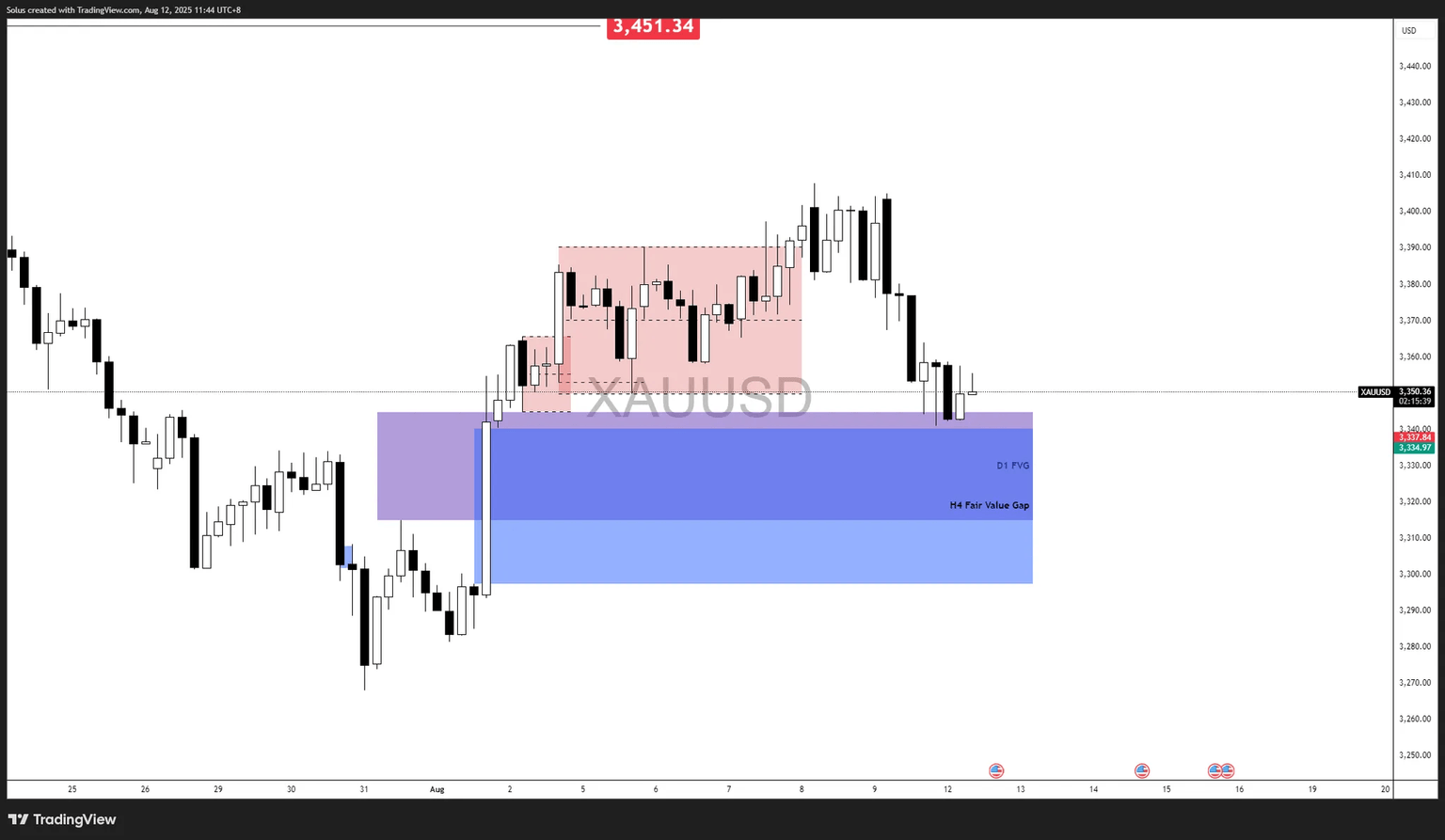 If price fails to sustain inside the Daily/4H FVGs and starts forming lower highs beneath $3,370, it could signal that distribution is forming at premium pricing, setting up a deeper pullback toward July’s base structure.
