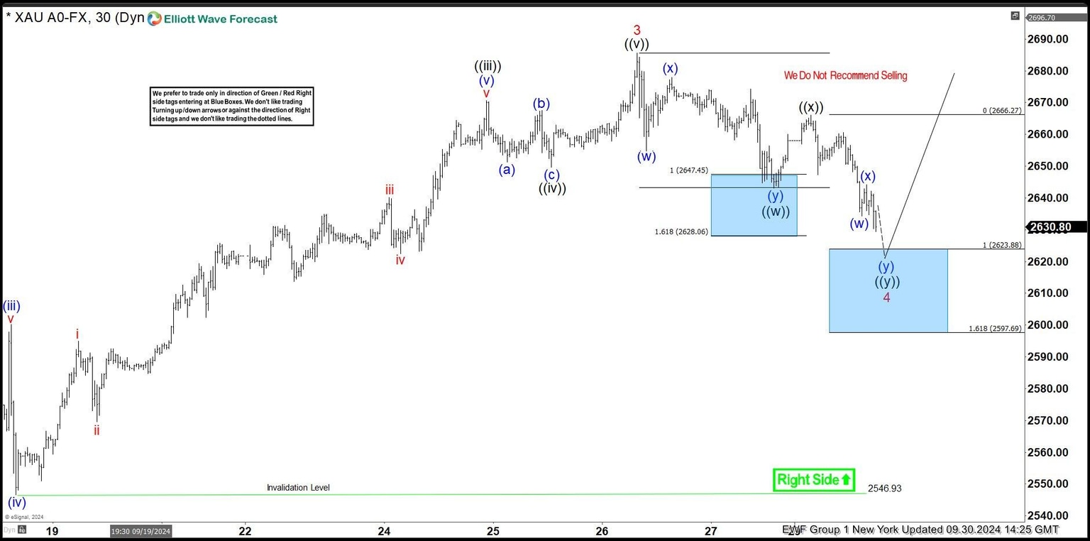 Here’s the one-hour Elliott wave Chart from the 09/30/2024 NY update. In which, the rally to $2685.58 high ended wave 3 & made a pullback in wave 4. The internals of that pullback unfolded as Elliott wave double three structure where wave ((w)) ended at $2643.02 low. Then a short-term bounce to $2665.99 high-ended wave ((x)) & started the next leg lower in wave ((y)) towards $2623.88- $2597.89 equal legs area. From there, buyers were expected to appear looking for new highs ideally or for a 3-wave bounce minimum.