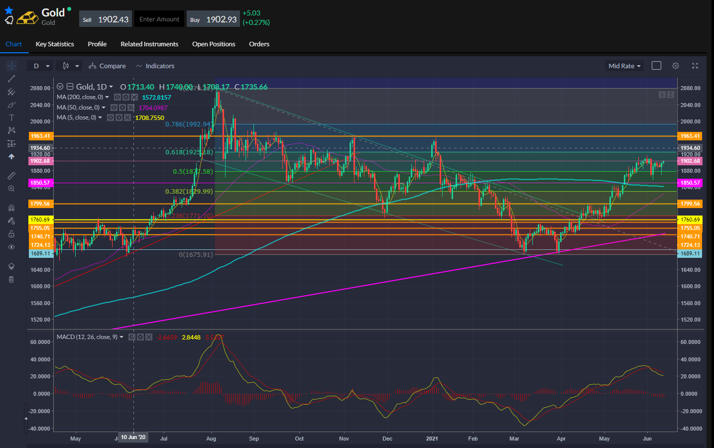 With yields sinking to fresh 3-month lows, real rates (TIPS) shot lower too, giving a helping hand to gold. The set up for gold looks promising – rising inflation + a Fed willing to keep its thumb on yields, producing even-more negative real rates. Prices have clawed back the $1,900 level and could be heading for the $1,960 region if the recent peak at $1,196 can be cleared. Failure to retain the $1,900 could see the 50% retracement at $1,877 again.