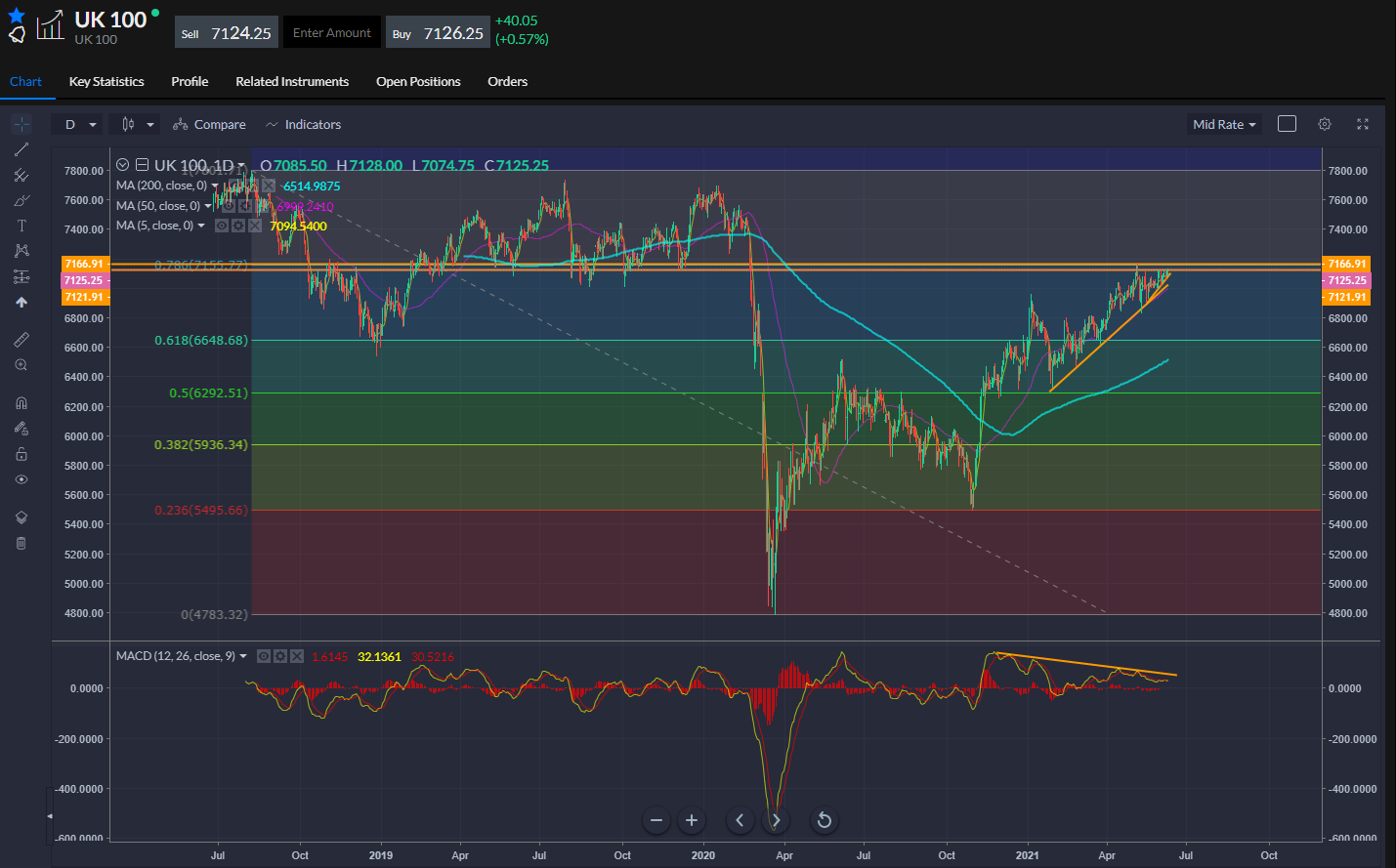 The FTSE 100 is testing the near-term highs around 7120 in early trade – a break could call for test of the post-pandemic peak at 7,164 at the top of the ascending triangle. Continued MACD divergence is a headwind.