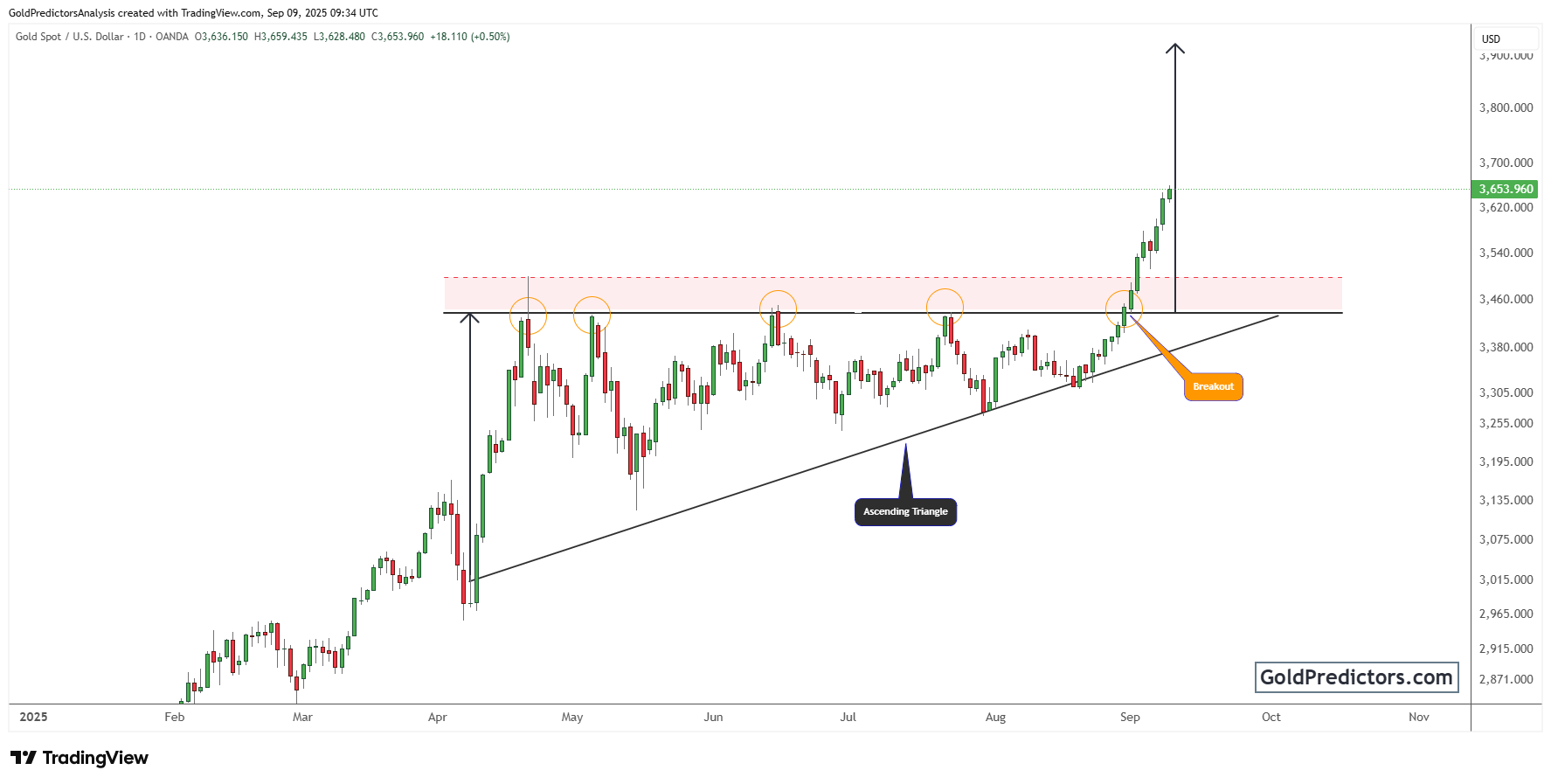 The gold chart below shows a clear breakout from an ascending triangle pattern that formed over recent months. Notably, the setup was defined by multiple tops near $3,460–$3,475 and higher lows that steadily pushed the price upward. As a result, this formation reflected steady buying interest and narrowing price action, as demand continued to build below key resistance. Over time, the triangle developed between April and early September, forming a well-defined technical base for a potential breakout.