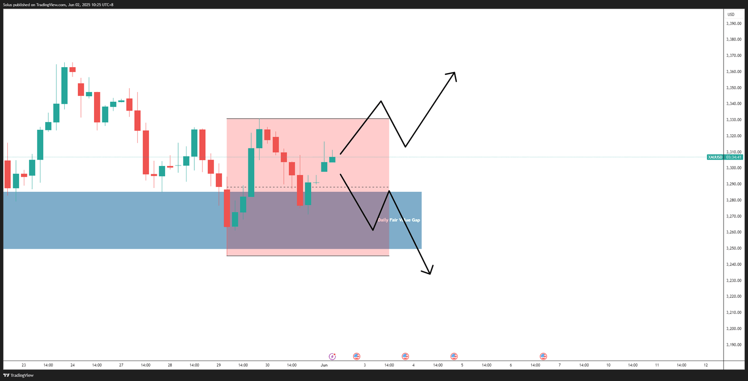 As long as the Daily Fair Value Gap holds resting at 3250 - 3285 level, we might see Gold to have the potential to seek upside liquidity above the next high situated at t 3370 level. The sweep below the Daily range also tells us that orders below that range have been taken out. If this is confirmed sweep of liquidity, we don't we price to go under the last candle where the sweep was created and we'd want to see momentum to the upside for potential new highs. NFP print could further add volatility on Gold this coming Friday.