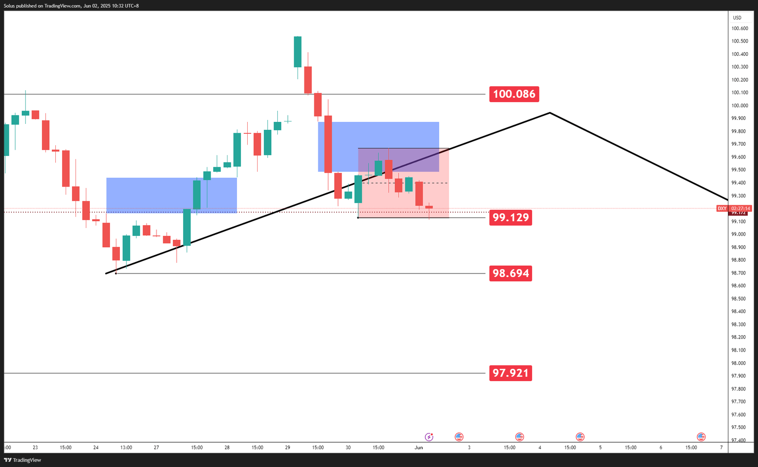 Dollar is still experiencing headwinds as it hovers near the immediate support level resting at 99.129 level. If we'd like to see more upside on Gold, we'd want a break on the Dollar, and ultimately, reaching the 2025 All-Time Lows at 97.921 level.