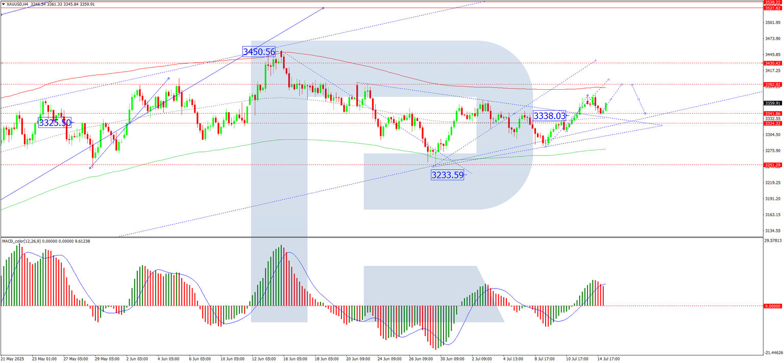 On the H4 chart, XAU/USD broke above the 3,340 level, hitting its local target of 3,373. Today, the market has seen a technical pullback to 3,340 (testing from above) before initiating a new upward wave towards 3,400. Once this wave concludes, we anticipate a corrective retracement to 3,340, followed by a potential further rise to 3,434. This scenario is supported by the MACD indicator, where the signal line remains above zero and pointing firmly upwards.