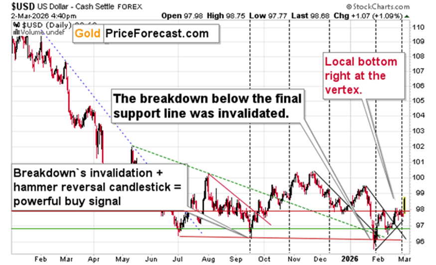 The implications for the precious metals market are – of course – bearish. And today’s performance of mining stocks and silver tells us that PMs are ready to act on the USD Index’s trigger.