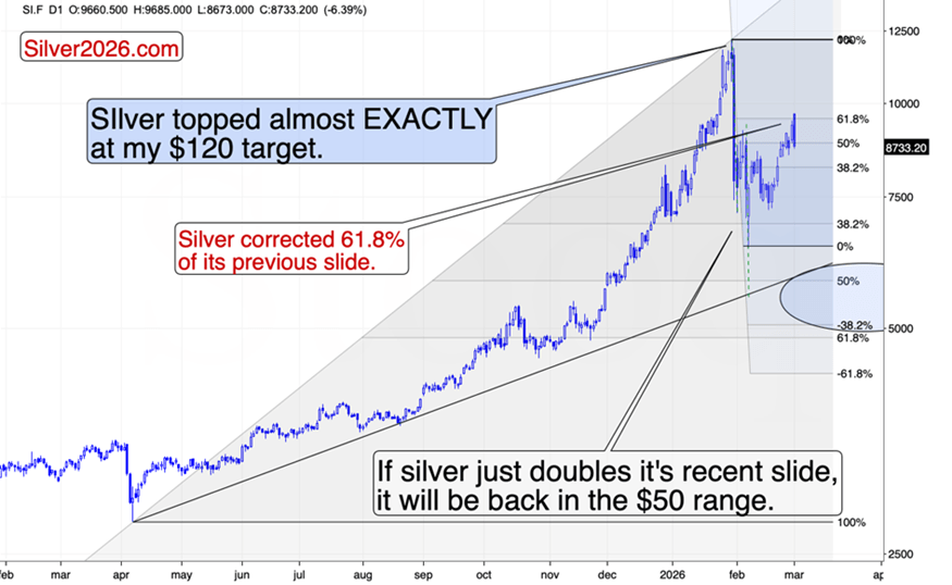 Pretty much nothing. Silver outperformed on a very short-term basis right before / during the peak uncertainty, and it reversed its course at the most classic technical resistance imaginable – the 61.8% Fibonacci retracement level.