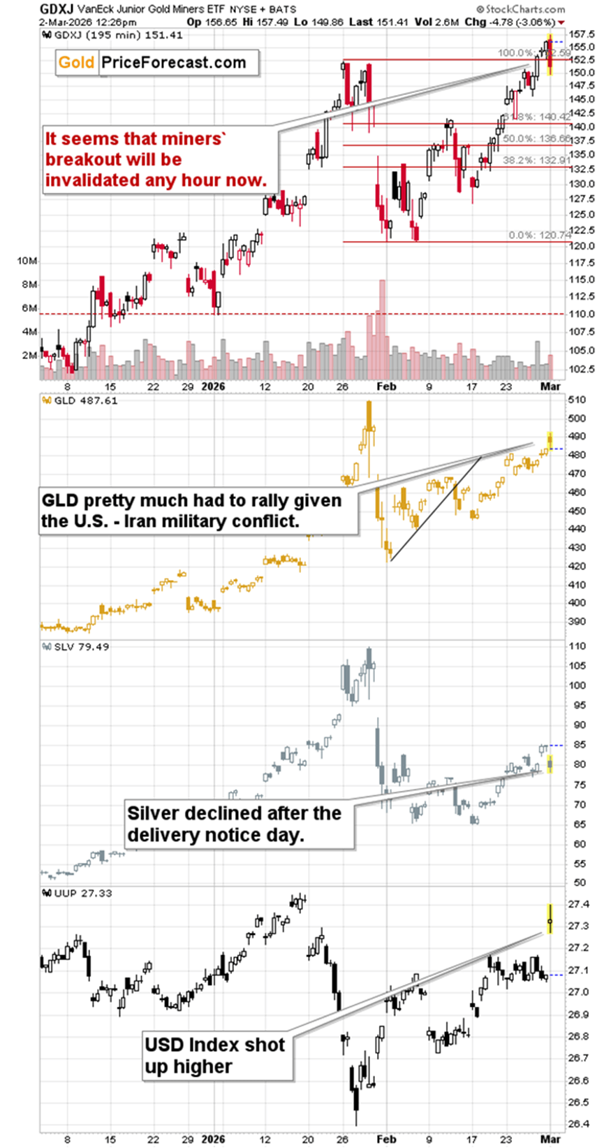 The big players most likely used this opportunity to unload their mining stocks onto the public that is buying today. Think about it – how much supply of mining stocks did the market have to absorb for the price of the GDXJ to decline today – despite the new military conflict?
