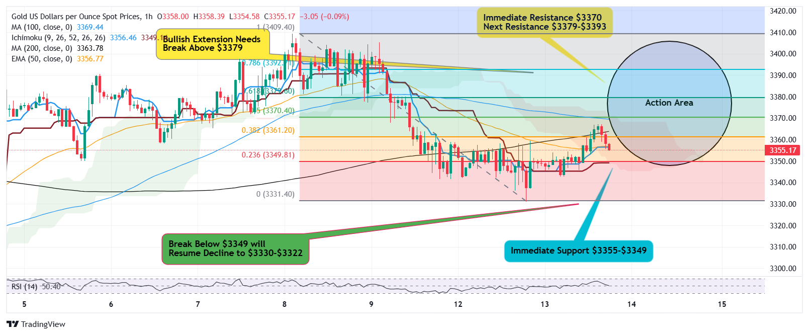 If price breaks below $3349, selling can extend to $3332-$3322.