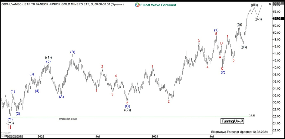 Daily Elliott Wave Chart of GDXJ shows that wave III rally is in progress as an impulse. Up from wave II, wave ((1)) ended at 41.16 and pullback in wave ((2)) ended at 30.46 with internal subdivision as an expanded flat. The ETF then rallied again in wave ((3)) as a nest. Up from wave ((2)), wave (1) ended at 49.13 and pullback in wave (2) ended at 40.26. The ETF has extended higher again in wave (3). Up from wave (2), wave 1 ended at 48.47 and wave 2 pullback ended at 42.51. Expect the ETF to continue higher within wave (3) of ((3))