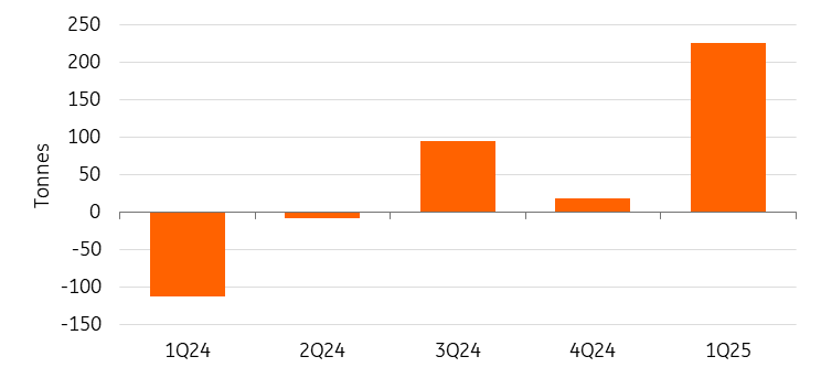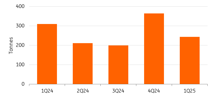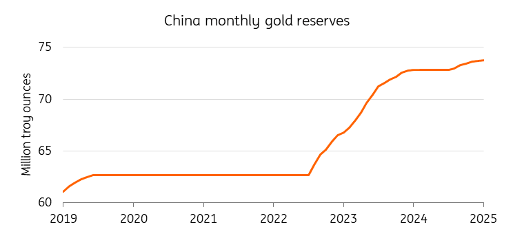 China is also buying less gold. In April, China’s central bank expanded its gold reserves for the sixth consecutive month, however by less than in previous months. Reported gold reserves in China rose by 2.2 tonnes in April, lifting the total to 2,295 tonnes, or 6.8% of overall reserve assets. So far in 2025, China has announced an increase of 14.9 tonnes in its official gold holdings.