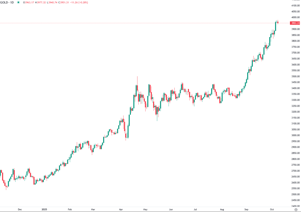 Gold prices rose in early Tuesday trading, touching a fresh all-time high before retreating to just below $3,950. The precious metal is being supported by strong safe-haven demand driven by ongoing economic and geopolitical uncertainty, further heightened by the US government shutdown. Another supportive factor is the growing expectation that the Federal Reserve will cut rates at least twice more before the end of the year. Against this backdrop, there may be scope for further increases in the price of the precious metal as it continues to approach the key psychological level of $4,000. However, there are also some headwinds. The dollar’s gains over the past two sessions could cap the upside for gold, as could some profit-taking following the recent rally, which has pushed prices into technically overbought territory.