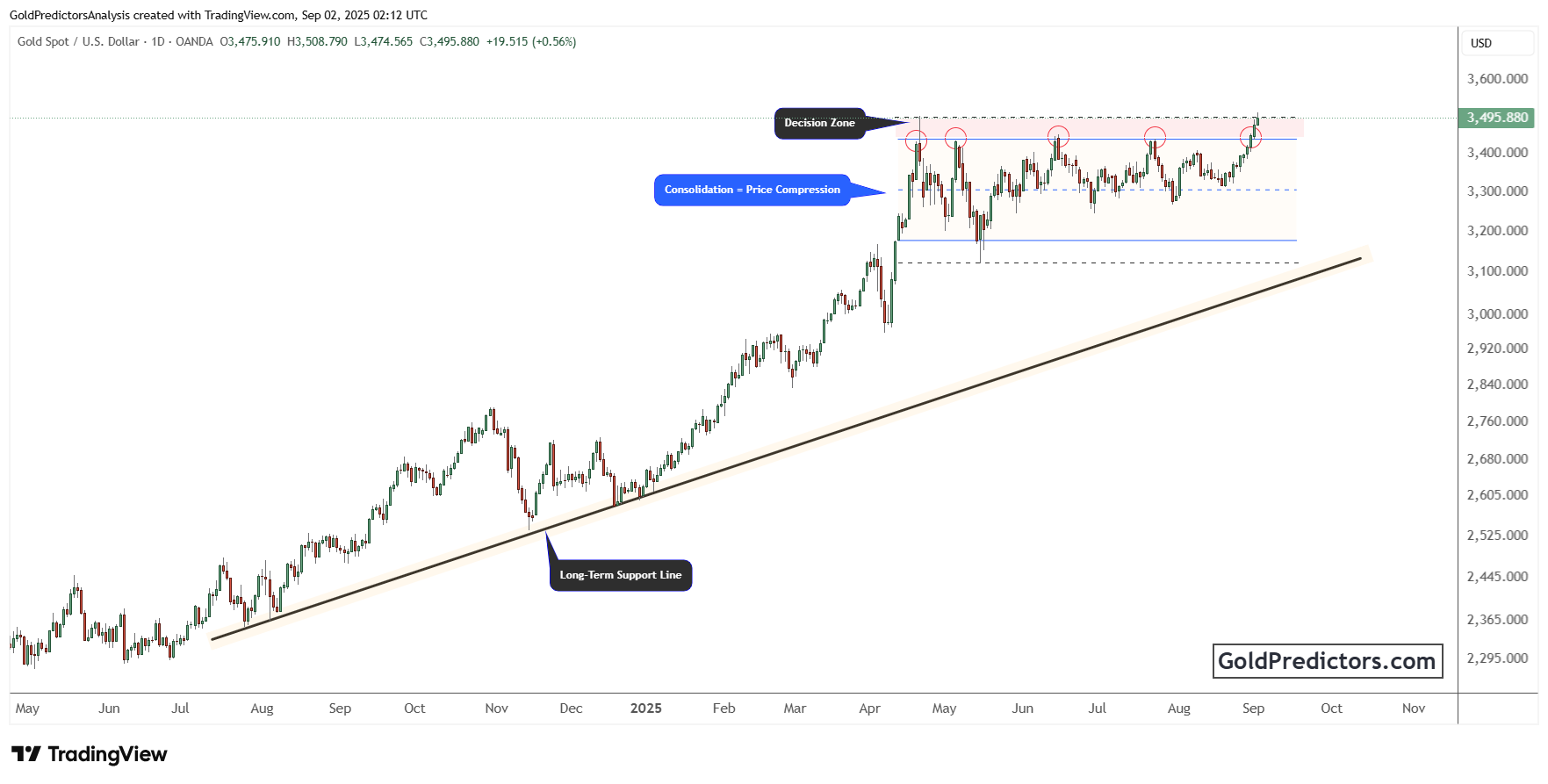 Notably, three clear rejection points have occurred near $3,490. Each attempt to break through the top of the range has failed so far. However, this resistance zone is now under pressure once again. The chart identifies this region as a “Decision Zone,” and a breakout above it could signal the start of a new rally.