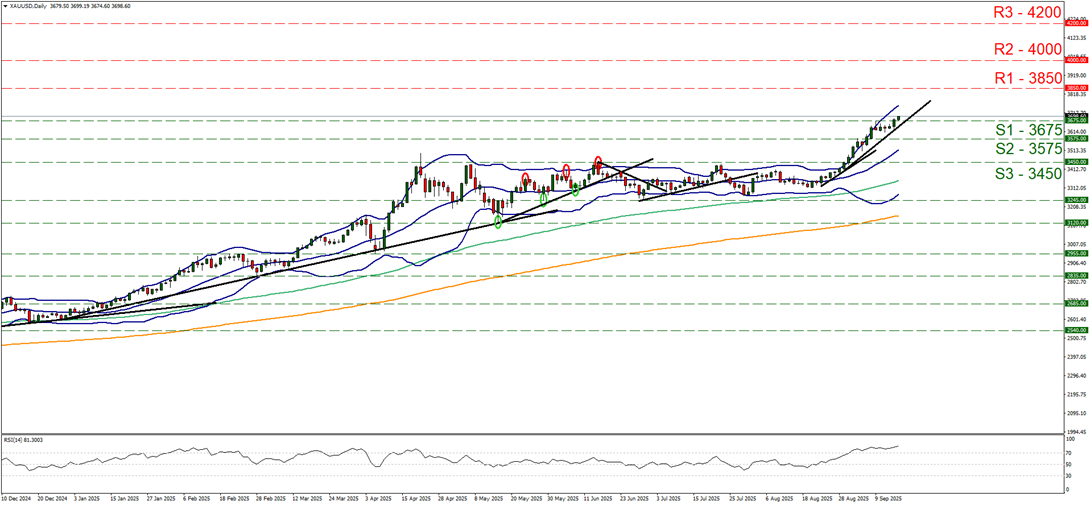 Gold’s price was able yesterday to finally break the 3675 (S1) resistance line, now turned to support and is now reaching new record high levels after some stalling. The breaking of the $3675 per ounce level, rejuvenates the bullish outlook for the precious metal shifting the upward trendline guiding it since the 22nd of August, to the right as a new higher peak seems to be forming. At the same time the RSI indicator remains above the reading of 70 and is still rising, even slightly, showcasing a strong bullish market sentiment for the precious metal, yet at the same time warns that a correction lower for the precious metal’s price, is also possible, as gold seems to be in overbought territory. On the flip side gold’s price has been in overbought territory since the beginning of the month without any correction lower, and the distance between the upper Bollinger band and gold’s price action suggests that there is still room for the precious metal’s price to rise further. Should the bulls maintain control as expected, we may see the bullion’s price aiming for the 3800 (R1) resistance line. Should the bears take over, we may see gold’s price tumbling, breaking the 3675 (S1) support line and continue to break the prementioned upward trendline in a first signal that the upward motion has been interrupted and continue even lower to breach the 3575 (S2) support barrier and start aiming for the 3450 (S3) support level.
