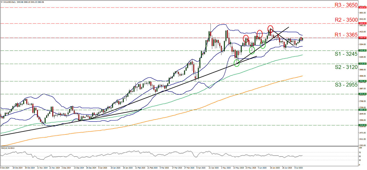 Gold’s price remained in a sideways motion just below the 3365 (R1) resistance line, constantly testing the R1 level. The RSI indicator continues to run along the reading of 50 implying a relatively indecisive market for the precious metal’s direction. Furthermore, we note the narrowing of the Bollinger bands, which implies an easing of volatility for gold’s price which could allow the sideways motion to continue. Hence we maintain our bias for the sideways direction to be maintained at the current stage. Yet we note that the price action as noted at the start is constantly testing the R1, which in turn may imply some bullish tendencies. Yet, for a bullish outlook we would require a clear break above our 3365 (R1) resistance line with the next possible target for the bulls being the 3500 (R2) resistance level, which is also a record high level for the precious metal’s price. On the flip side, for a bearish outlook we would require a clear break below the 3245 (S1) support line with the next possible target for the bears being the 3120 (S2) support level.