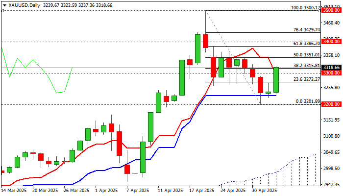 The metal’s price returned above $3300 mark and cracked important resistance at $3315 (10DMA / Fibo 38.2% of $3500/$3201 bear-leg) to generate signal that corrective phase from new all-time high may be over.