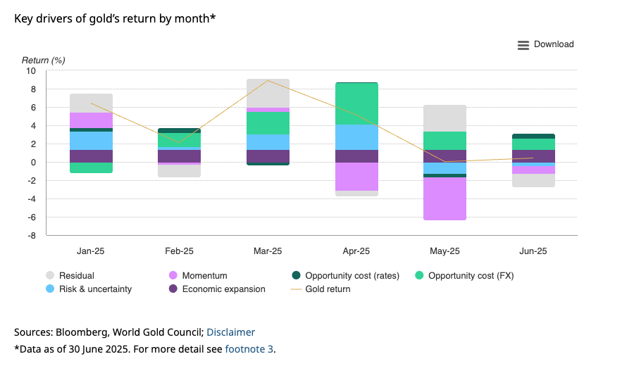 The World Gold Council has developed a Gold Return Attribution Model (GRAM) to evaluate the factors contributing to gold’s performance. Low opportunity cost, momentum, and a risk environment were significant factors through H1, contributing to about 16 percent of gold's returns.