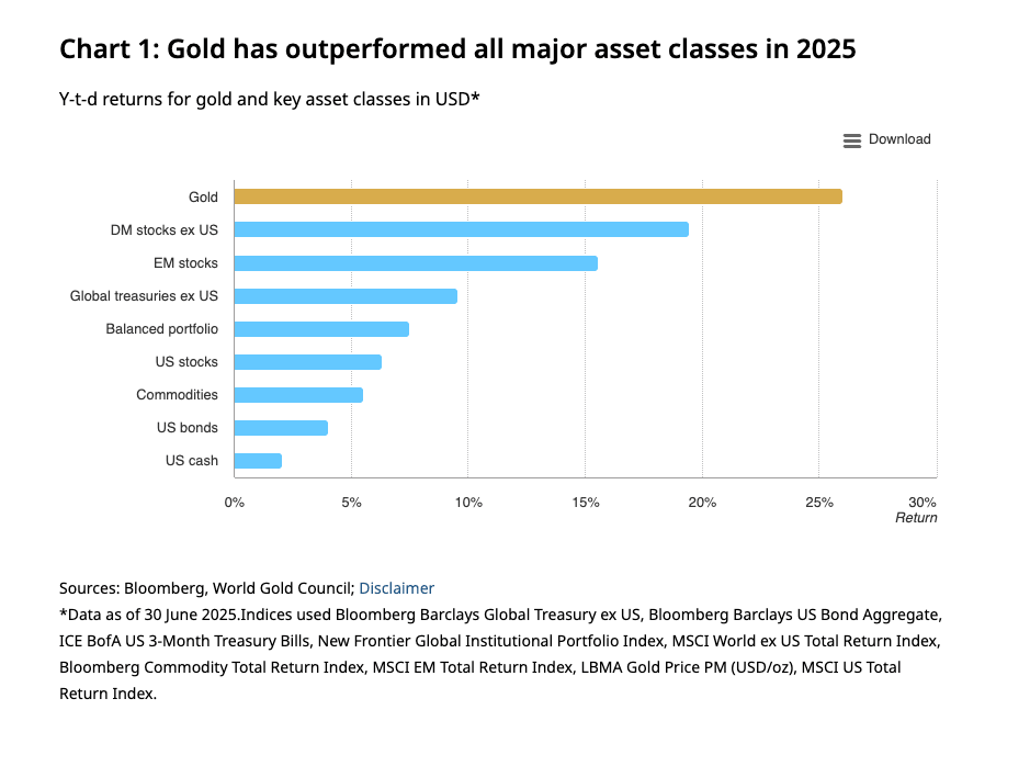 Gold was up nearly 26 percent through the first six months of 2025, ranking as the top-performing asset class.