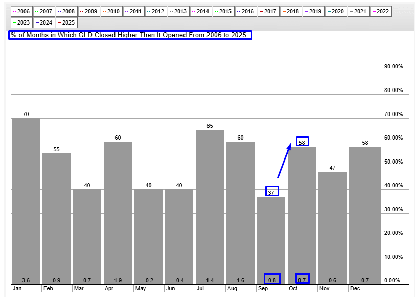 Since 2006, GLD has posted September decline of -0.8% in 37% of the years, while October has seen a rise of 0.70% in 58% of the years.