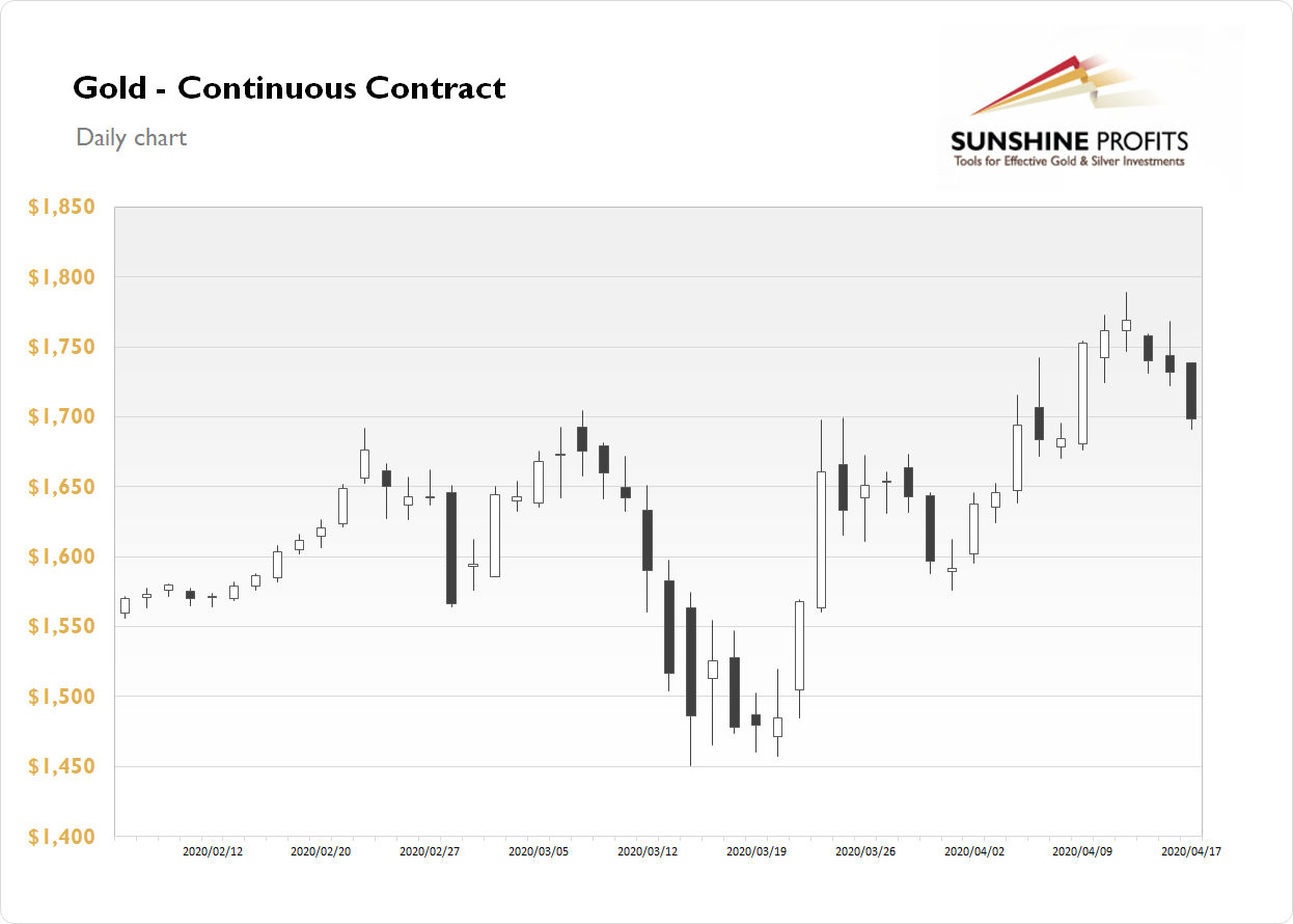 The gold futures contract lost 1.90% on Friday, as it retraced more of its recent advances. The market broke above the short-term consolidation and it reached new medium-term high last week. On Tuesday it was the highest since November of 2012. The high was at $1,788.80. Mounting pandemic fears were supporting the demand side and gold was acting as a safe haven asset. But since last Tuesday we've seen some profit-taking action and a potential downward reversal.