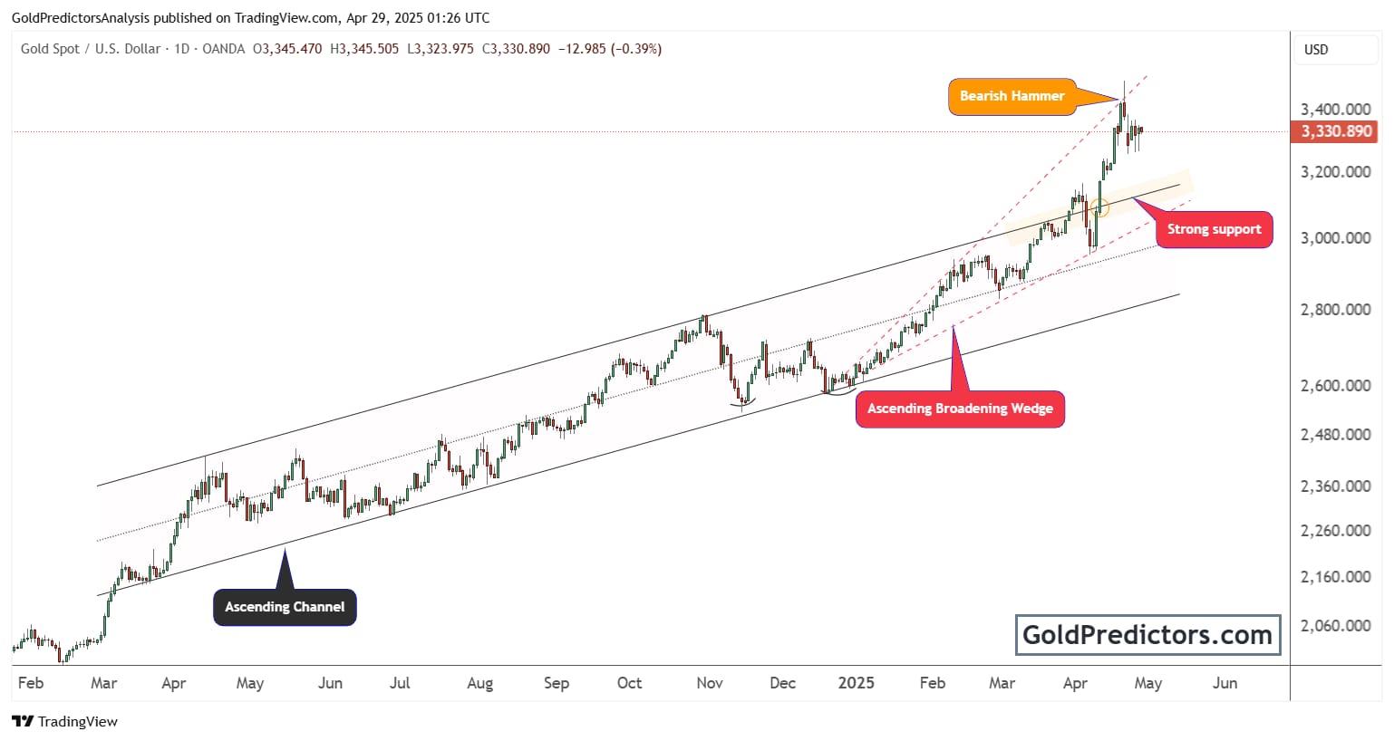 As gold tested this new high, a bearish hammer candle formed at the top. This is a key reversal signal. It indicates that buyers pushed the price higher during the session, but sellers regained control by the close. This bearish hammer often precedes a correction or pause in the uptrend.