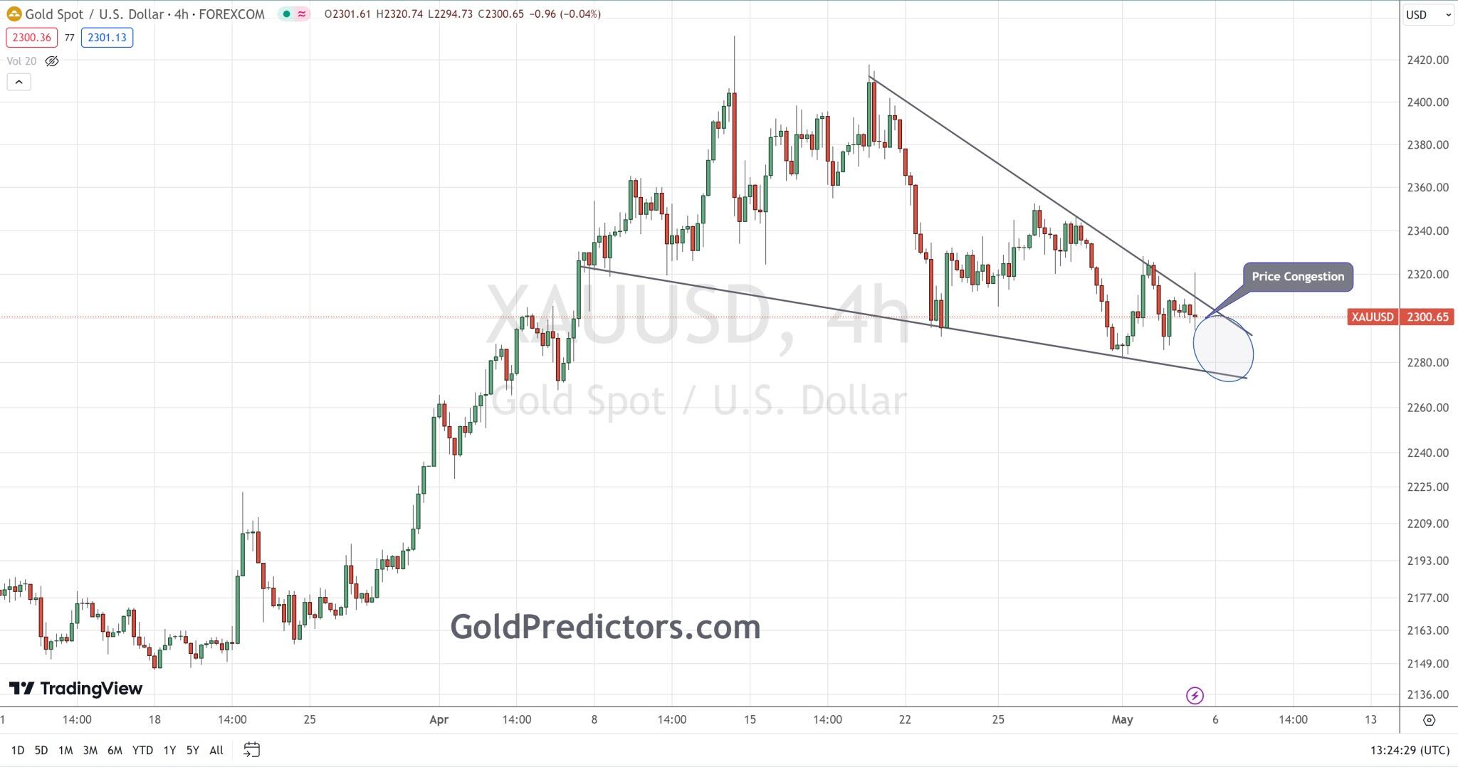 This triangle on the chart presents the ongoing struggle in the gold market as it attempts to find a new equilibrium. Significant market events such as the Federal Open Market Committee (FOMC) meetings and the Non-Farm Payroll (NFP) announcements have passed. Yet, the gold prices have remained confined within this triangle. As we approach the apex of this formation, the market stands on the cusp of a potential breakout. This impending breakout signals the next substantial move in the market. However, traders may exercise caution due to the potential of a fake breakout, possibly due to the Labor Day on May 1st, which typically sees reduced market activity, which may lead to fake price movements, or ‘fake breakouts,’ as the markets resume full operations.