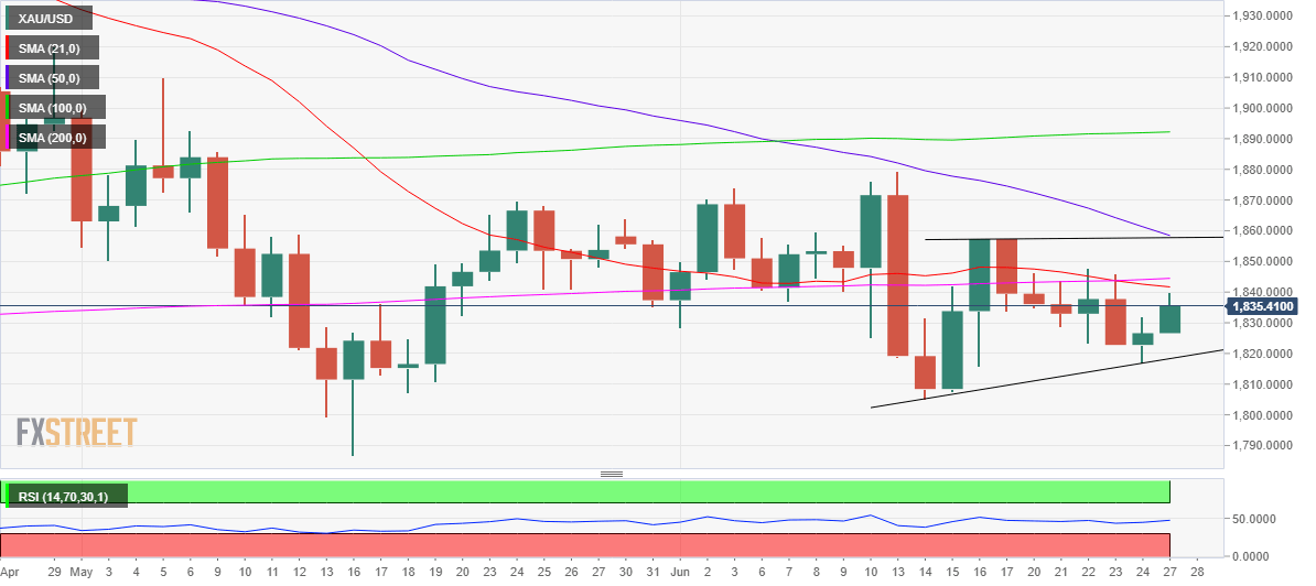 The yellow metal has eased after testing the short-tern critical 21-Daily Moving Average (DMA) resistance at $1,842 on its renewed upside. The immediate resistance aligns at the horizontal 200 DMA, now at $1,845.