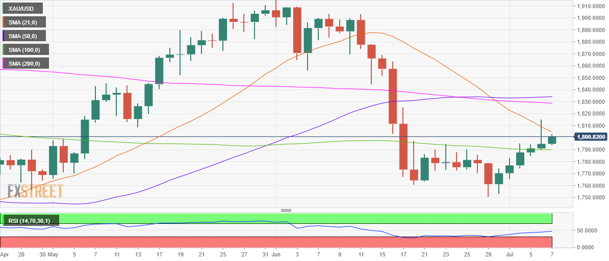 Heading into the FOMC minutes showdown, gold price is once again testing bullish commitments above $1800, as the persistent weakness in the US rates and cautious market mood continue to underpin. Further, the US dollar’s modest retreat from overnight highs also helps revive the upbeat momentum in gold price. The next direction for gold depends on the Fed’s June meeting’s minutes dropping in at 1800 GMT later on Wednesday, which could disappoint the hawks, especially after the world’s powerful central bank delivered a hawkish surprise at its policy meeting last month. In the meantime, the broader market sentiment and covid updates will likely influence gold’s price action.