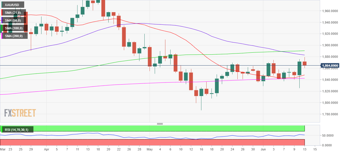 The market anxiety over an incoming recession shot through the roof after the US inflation surged to 8.6% YoY in May, hitting a fresh 40-year high. The median forecasts were for an unchanged reading of 8.3% in the reported period. In an immediate reaction to the critical US Consumer Price Index (CPI) release, gold price hit a three-week low at $1,825, as the dollar soared alongside the Treasury yields on a spike in aggressive Fed tightening bets. The CME FedWatch Tool showed a 26.8% chance of a 75 bps Fed rate hike at the June 15 meeting. Investors reassessed the impact of rapid and bigger rate rises by the Fed on the economic growth, as major US investments back predicted the economy tipping into recession this year. Intensifying growth and inflation fears saved the day for gold bulls, as the price staged a solid rebound from multi-week troughs to clock fresh monthly highs at $1,876 on Friday. The collapse in the Wall Street indices amid heightening risk-off mode also helped XAUUSD to regain its safe-haven status.