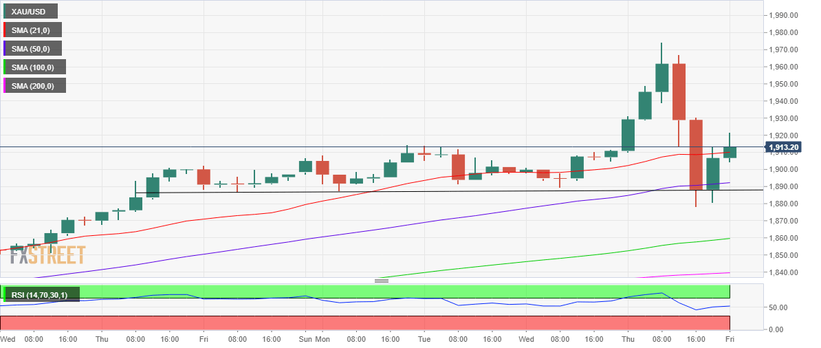 Gold’s four-hour chart is pointing to further upside risks, as the price recaptures the 21-Simple Moving Average (SMA) at $1,910. That level was the previous key resistance.