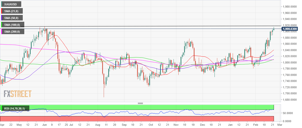 - Gold price pauses its bullish momentum just below June 2021 highs of $1,917.