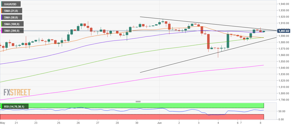 At the time of writing, gold price is flirting with the 50-simple moving average (SMA) at $1896, following a retreat from three-day highs of $1903.
