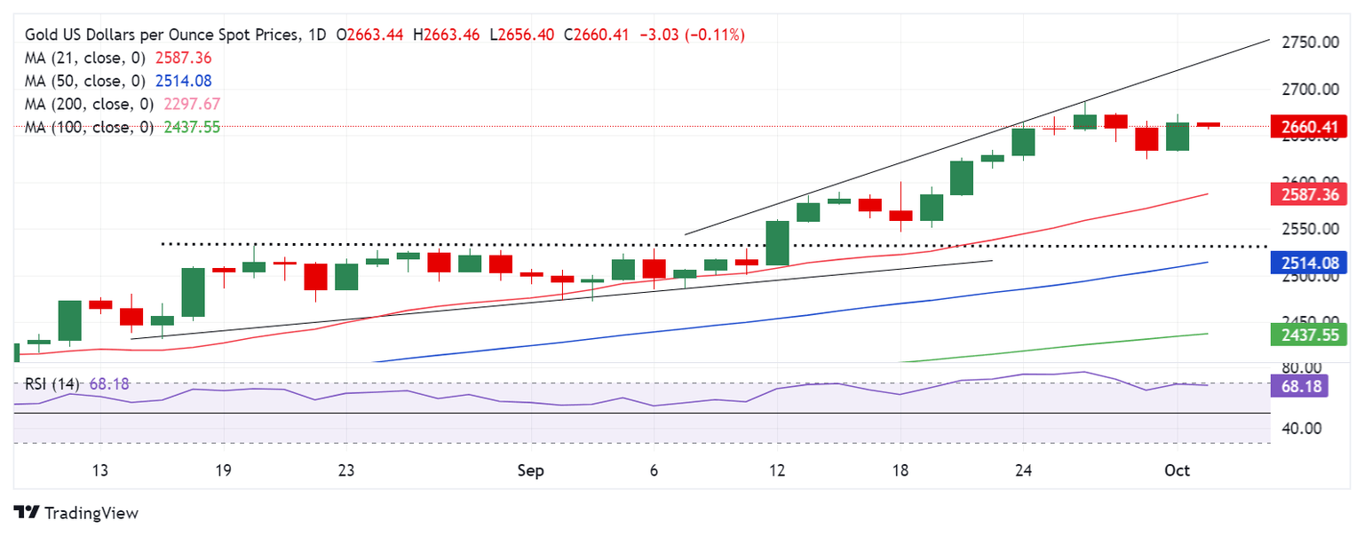 The daily technical setup for Gold price remains constructive as the 14-day Relative Strength Index (RSI) holds firm near 68.00, despite turning slightly lower.