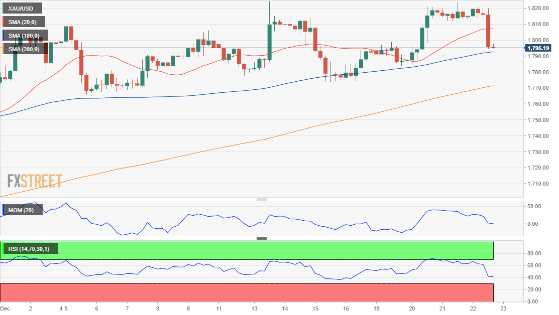 XAU/USD pressures intraday lows in the $1,795 price zone, further losing its bullish potential according to the daily chart but falling short of suggesting a steeper decline. For that, the pair would need to extend its current slump below $1,785.60, where the 20 and 200 SMAs converge. The shorter moving average currently crosses above the longer one, further limiting the downside. At the same time, technical indicators extended their slides, with the Momentum pressuring its 100 line and the RSI currently at around 55.
